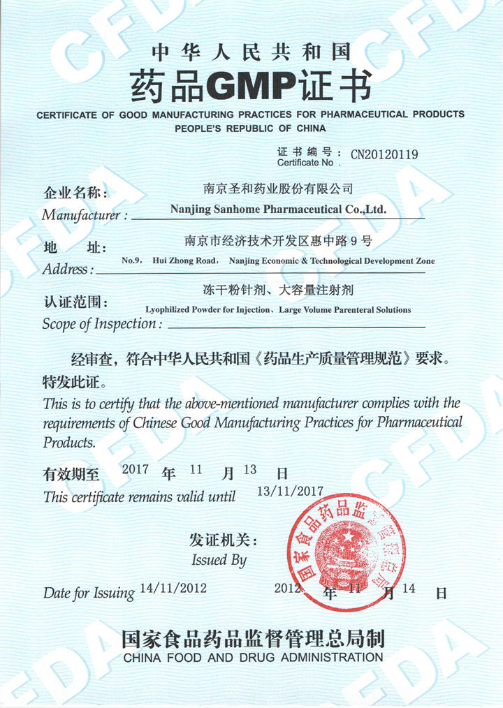In November 2012, freeze-dried powder injection, small-volume injection GMP certification, certificate number: CN20120119