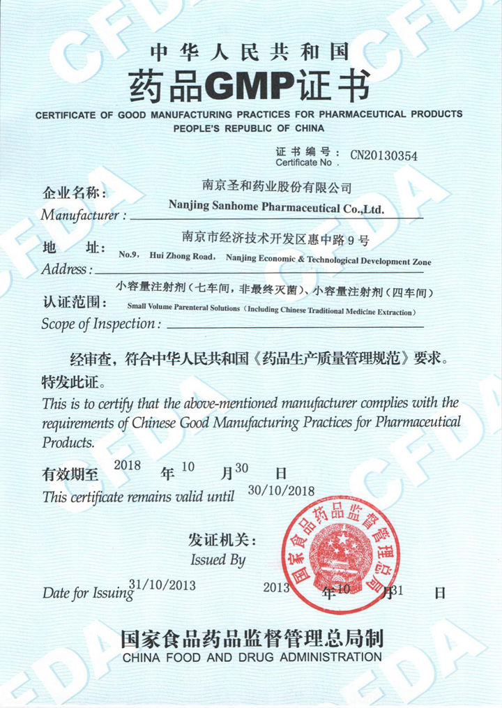 In October 2013, small-volume injection (the seventh workshop, not terminally sterilized), small-volume injection (the fourth workshop) GMP certification, certificate number: CN20130354