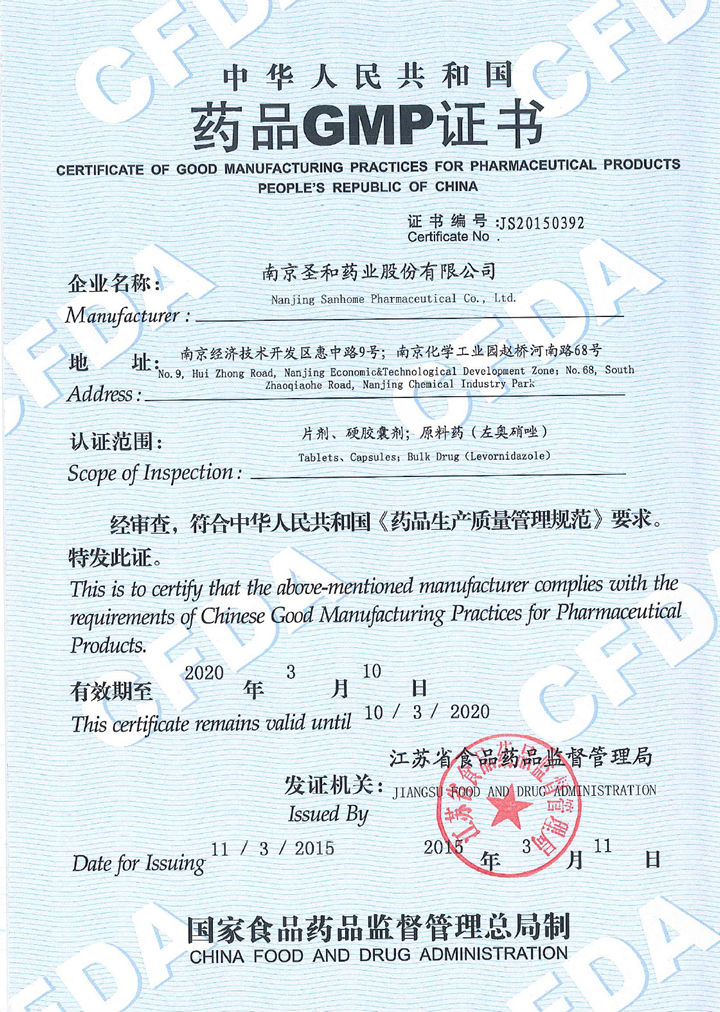 In March 2015, tablet, capsule, API (levornidazole) GMP certification, certificate number: JS20150392